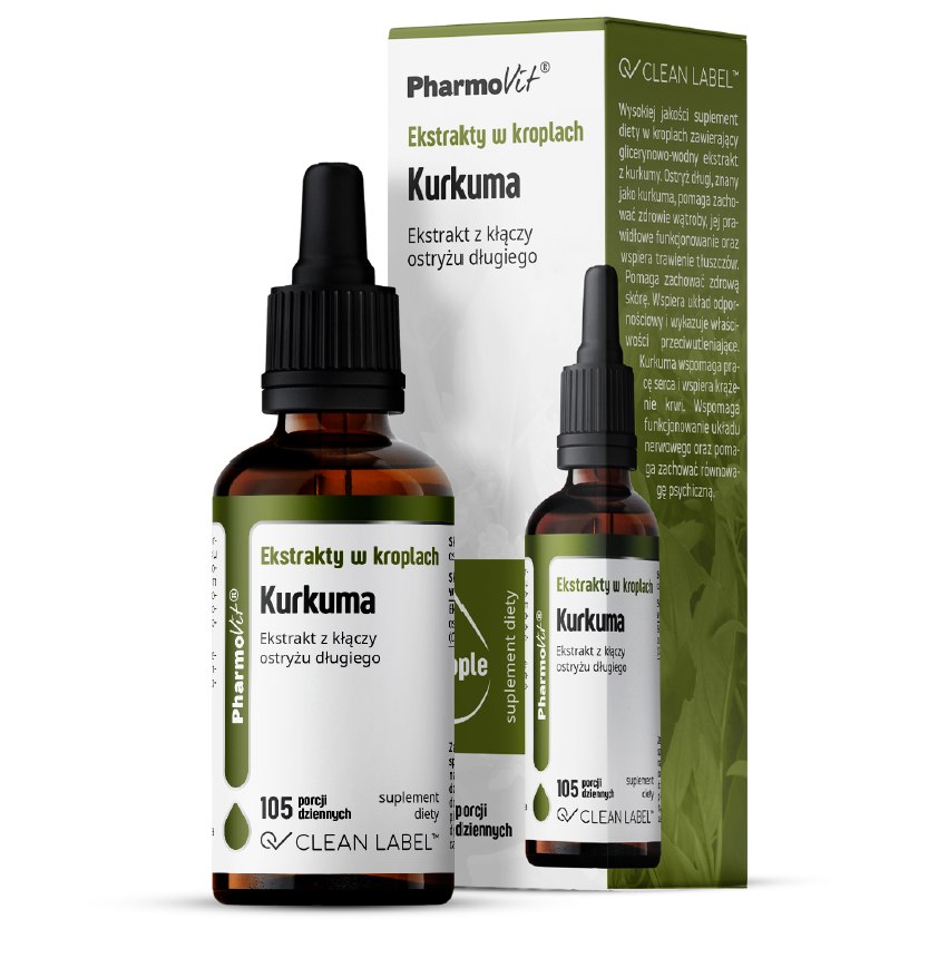 Wysokiej jakości suplement diety w kroplach zawierający glicerynowo-wodny ekstrakt z kurkumy. Ostryż długi, znany jako kurkuma, pomaga zachować zdrowie wątroby, jej prawidłowe funkcjonowanie oraz wspiera trawienie tłuszczów. Pomaga zachować zdrową skórę. Wspiera układ odpornościowy i wykazuje właściwości przeciwutleniające. Kurkuma wspomaga pracę serca i wspiera krążenie krwi. Wspomaga funkcjonowanie układu nerwowego oraz pomaga zachować równowagę psychiczną.